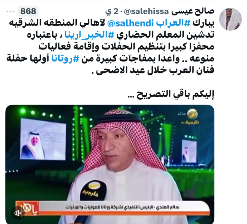 نقل الأستاذ صالح عيسى، مدير الشؤون الإعلامية لمجموعة روتانا، عبر حسابه على منصة “إكس”، تهنئة الرئيس التنفيذي للمجموعة سالم الهندي لأهالي المنطقة الشرقية بمناسبة تدشين المعلم الحضاري الجديد الخبر أرينا.