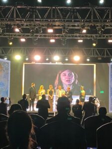 وتكريمهم للممثلين. كما أهدت التكريم لكل مناضل في العالم، ولزوجها الفنان هاني عادل، ولعائلتها وبلدها الحبيب بيروت، متمنية أن تمر الأوضاع الصعبة التي يعيشها لبنان بسلام.