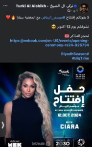 ونشر آل الشيخ صورة لسيارا عبر حسابه الرسمي على فيسبوك، معلقًا: “لا يفوتكم افتتاح موسم الرياض، مع المغنية سيارا، نشوفكم يوم 12 أكتوبر”.