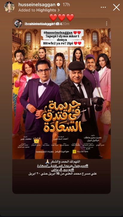 حرص عدد من رواد مواقع التواصل الاجتماعي، من بينهم إبراهيم الصباح وفرح أحمد وهويدا إسماعيل، على تهنئة مدير الإنتاج حسين السجّان بمناسبة مسرحيته الجديدة «جريمة في فندق السعادة»، وذلك بعد أن نشر البوستر الرسمي للعمل عبر حساباته على السوشيال ميديا، حيث تفاعل معه الجمهور ونجوم الوسط الفني متمنين له مزيدًا من النجاح.